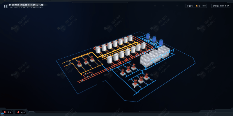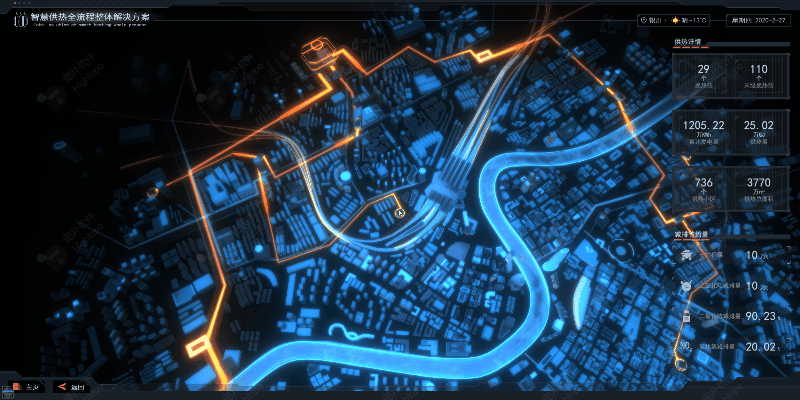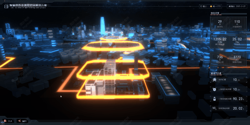 Hightopo visualization solution simulates the whole city layout and utilizes the 3d model and 3d animation to indicate the pipeline. The hot water travels through an underground insulated pipe network to heat interface units located in each building.